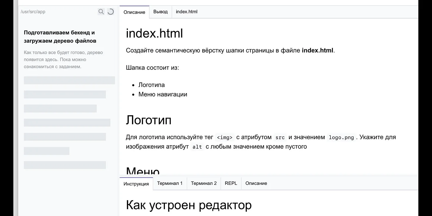 Бекенд практик спроектирован так, чтобы можно было стартовать задачи почти любой сложности. На фоне могут подниматься база данных, веб-серверы и всё остальное, что заложено в конкретное задание. С точки зрения ученика это выглядело просто: запустил практику — и ждёшь. Мы даже добавляли поясняющий текст, почему это не происходит мгновенно (в реальности устройство ещё чуть сложнее).