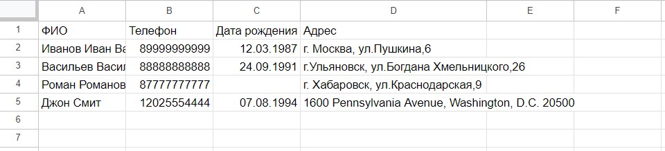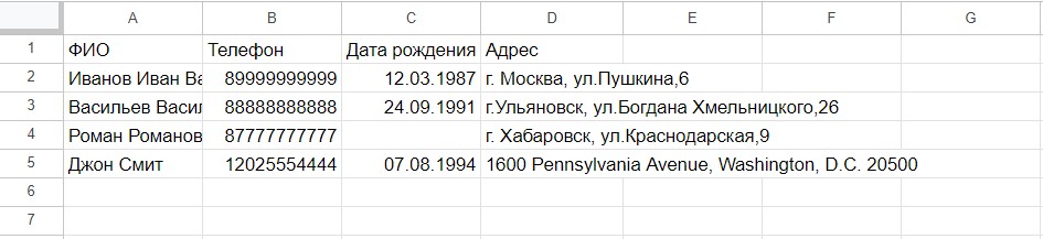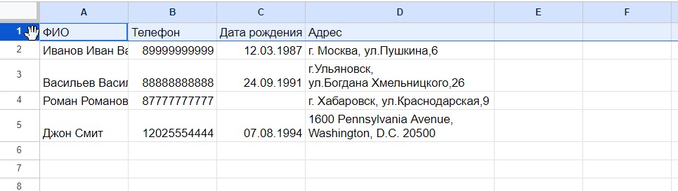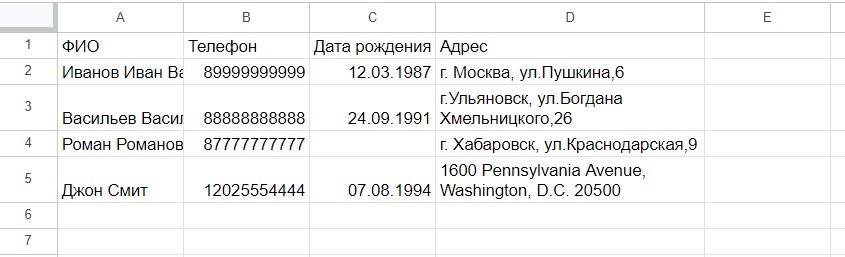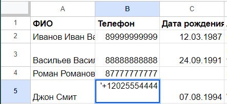 Сейчас номер телефона Джона Смита отображается неверно, так как в начале не хватает +. Для остальных номеров это не критично, так как они начинаются с 8.
