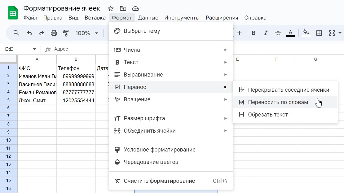 Постоянно увеличивать ширину ячеек, чтобы в них отображалось всё содержимое не всегда представляется возможным. Для этого подойдёт функция переноса текста на следующую строку.